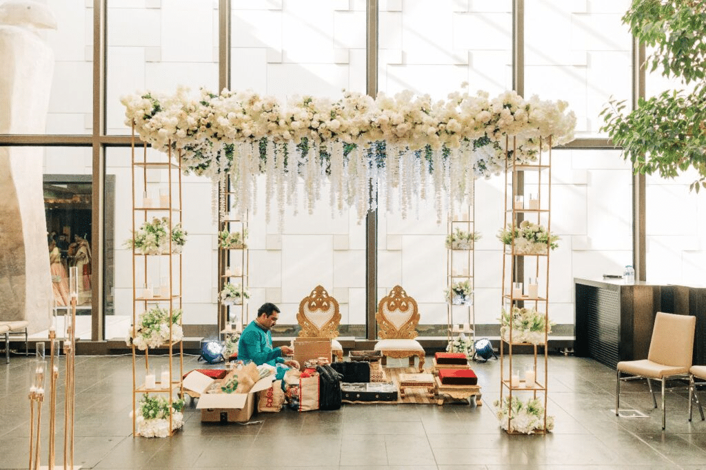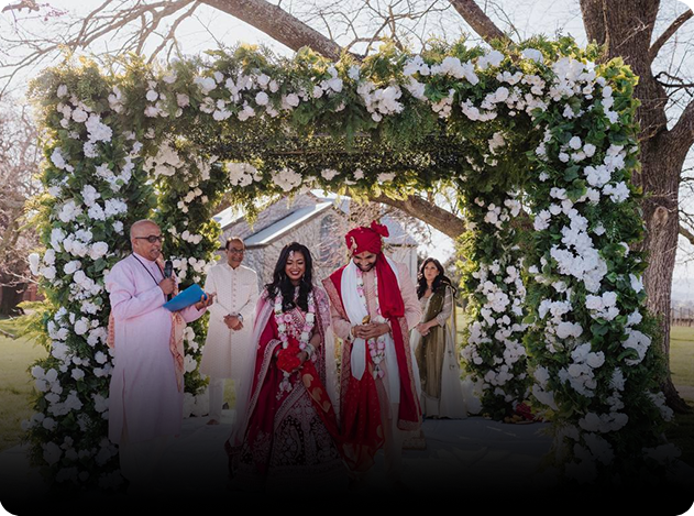 Our Indian wedding mandaps in Melbourne celebrate Vedic rituals, with the four mandap pillars symbolising strength, harmony, and family.